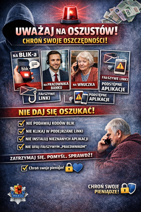 Oszustwo na BLIK-a, jest najczęstszym rodzajem oszustw, którego pokrzywdzonymi stają się osoby w różnym wieku. Nadal oszuści wykorzystują również inne metody, by przejąć nasze oszczędności, takie jak: „na pracownika banku”, „na wnuczka”, „na policjanta”, klikając w przysłany link, instalując aplikację. Niestety w ostatnim czasie kilku mieszkańców Sieradza padło ofiarą oszustów. Apelujemy o czujność, rozwagę i rozsądek w telefonicznych kontaktach z nieznajomymi.