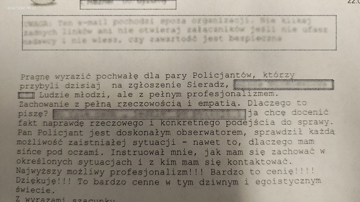 22 stycznia 2026 roku policjanci zostali wezwani na interwencję w związku z odgłosami awantury dobiegającej z jednego z lokali mieszkaniowych. Zaniepokojony świadek zadzwonił z prośbą o sprawdzenie czy jakaś przebywająca tam osoba nie znajduje się w niebezpieczeństwie. Okazalo się, ze nikt nie potrzebuje pomocy. Sytacja związana była ze stanami chorobowymi jednego z doowników. Kilka dni później do Komendanta Powiatowego Policji w Sieradzu wpłynął e-mail z podziękowaniami dla interweniujących funkcjonariuszy. W przesłanej wiadomości autorka listu wyraża wdzięczność dla policjantów ogniwa patrolowego sieradzkiej komendy - post. Pauliny Postawy i st. post. Marcina Pędziwiatra za okazaną pomoc i zainteresowanie. Podkreśla, że podczas interwencji wykazali się nie tylko wysokim profesjonalizmem, ale przed wszystkim empatią, wrażliwością i wyjątkowym zaangażowaniem w pomoc drugiemu człowiekowi. Takie podziękowania są dla nas niezwykle ważne. Stanowią one nie tylko wyraz społecznego zaufania, ale również silną motywację do dalszej służby. Przypominają, jak istotna i potrzebna jest codzienna praca policjantów — często wykonywana w trudnych, wymagających i emocjonalnie obciążających sytuacjach. Słowa uznania, które dziś wybrzmiewają, są dowodem na to, że fundamentem policyjnej służby jest człowiek i pomoc drugiemu człowiekowi. Policja to nie tylko formacja, ale przede wszystkim służba oparta na odpowiedzialności, empatii i gotowości niesienia pomocy. Dziękujemy za docenienie pracy naszych policjantów. Każde podziękowanie ze strony obywateli jest dla nas bardzo ważne— daje ogromną satysfakcję, wzmacnia poczucie sensu pełnionej służby i stanowi silną motywację do dalszego zaangażowania na rzecz lokalnej społeczności.