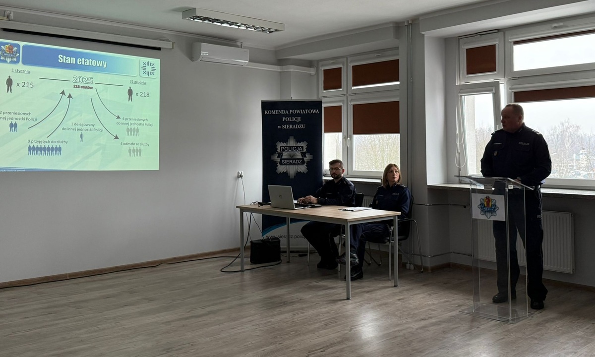 W sieradzkiej komendzie odbyła się narada roczna podsumowująca pracę policjantów za miniony rok. Komendant Powiatowy Policji w Sieradzu insp. Piotr Bielewski oraz p.o. I Zastępca Komendanta Powiatowego Policji Sieradzu podinsp. Tomasz Jamiński przedstawili ocenę stanu bezpieczeństwa oraz przedsięwzięcia i sukcesy w 2025 roku. Ubiegły rok to przede wszystkim bardzo dobre wyniki w walce z przestępczością i dobry poziom wykrywalności.