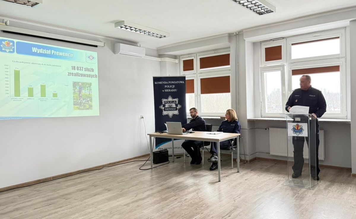 Komendant Powiatowy Policji w Sieradzu insp. Piotr Bielewski oraz I Zastępca Komendanta Powiatowego Policji Sieradzu podinsp. Tomasz Jamiński przedstawili ocenę stanu bezpieczeństwa na terenie powiatu sieradzkiego za 2025 rok. Analizie poddano pracę zarówno podległych komisariatów policji, jak również poszczególnych wydziałów. Szef sieradzkich policjantów swoje wystąpienie rozpoczął od omówienia struktury etatowej jednostki. Obecnie w sieradzkiej komendzie pełni służbę 218 policjantów. W 2025 roku przyjęto 9 nowych funkcjonariuszy. Powiększył się również tabor pojazdów służbowych, pozyskaliśmy 5 nowych radiowozów. Podsumowując prace pionu prewencji, Komendant wskazał, że policjanci zrealizowali 18 037 służb, co oznacza, ze ich liczba wzrosła o ponad 2360 w porównaniu do roku ubiegłego. .