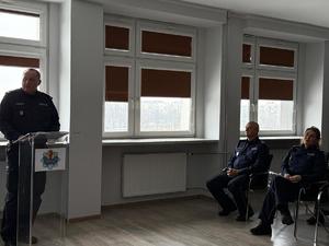 Następnym elementem odprawy było roczne podsumowanie pracy pionu kryminalnego sieradzkiej jednostki, która przedstawił p.o. I Zastępca Komendanta Powiatowego Policji w Sieradzu podinsp. Tomasz Jamiński. W 2025 roku nastąpił spadek ogólnej liczby przestępstw stwierdzonych – z 2045 do 1559, przy utrzymaniu dalszym ciągu wysokiego stopnia wykrywalności na poziomie ponad 78%. Podobna tendencja utrzymuje się jeśli chodzi o przestępstwa kryminalne. Nastąpił spadek stwierdzonych przestępstw rozbójniczych, bójek, kradzieży oraz przestępstw narkotykowych. Zastępca komendanta podkreślił, że bardzo ważnym elementem pionu kryminalnego jest zwalczanie przestępczości narkotykowej, gdzie co przełożyło się na utrzymanie wysokiej wykrywalności na poziomie ponad 96%. W 2025 zabezpieczonych zostało ponad 6 kg środków odurzających i substancji psychotropowych. Pan Komendant pokreślił również wysoce zadowalające wyniki w wykrywaniu sprawców przestępstw o charakterze gospodarczym. Poziom ten utrzymany jest na bardzo wysokie poziomie systematycznie od kilku lat. Sieradzka jednostka może pochwalić się uzyskanym w 2025 roku poziomem wykrywalności w zakresie cyberprzestępczości uzyskując 1 miejsce spośród wszystkich jednostek Policji garnizonu łódzkiego. Szczególne osiągnięcia sieradzka komenda uzyskała w zakresie przestępstw korupcyjnych. W województwie łódzkim uzyskano najlepszy wynik jeżeli chodzi o wykrytych sprawców i drugie miejsce w zakresie ujawnionych przestępstw tej kategorii.