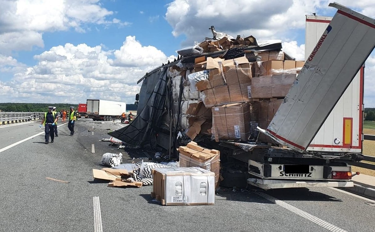Do pierwszego zdarzenia doszło 30 czerwca 2020 roku przed godz. 12.00. Jak wynika ze wstępnych ustaleń policji, na tył stojącej na pasie awaryjnym naczepy ciężarowego dafa, najechał 30-letni mieszkaniec powiatu piotrkowskiego kierujący ciężarówką marki Man. Przyczyną postoju dafa była awaria ogumienia. W wyniku zderzenia pojazdów uszkodzeniu ulega naczepa dafa, a jego ładunek wysypał się na jezdnię. Kierowca mana uderzył w bariery i doszło do wycieku paliwa. Na miejsce skierowani zostali funkcjonariusze wydziału ruchu drogowego sieradzkiej komendy. Policjanci poddali kierowców badaniu alkomatem, a jego wyniki wskazały, że byli oni trzeźwi. Wezwane pogotowie ratunkowe, przewiozło kierowcę mana do szpitala. Po wykonaniu badań opuścił on placówkę. 30-letni kierowca mana za spowodowanie kolizji został ukarany mandatem karnym.